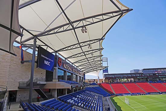 体育场馆:无论是足球场、篮球场,还是田径场,膜结构看台遮阳棚不仅为观众提供了舒适的观赛环境,还让场馆整体显得更加时尚大气。