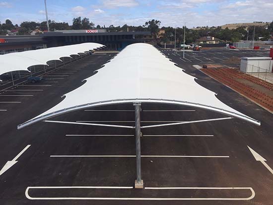 该膜结构停车棚不仅为车辆提供了全方位的保护,还提升了商业广场的整体视觉效果。膜材的透光性为停车场带来了充足的自然光线,降低了能源消耗。