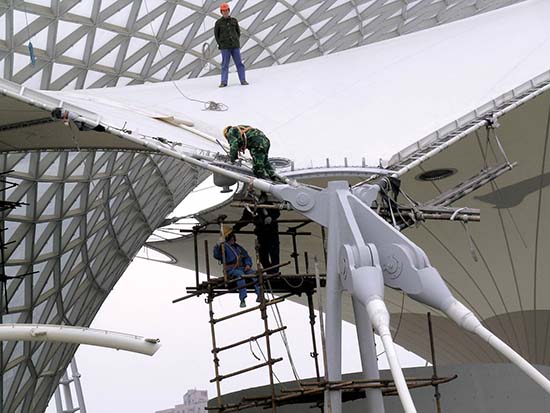 膜材安装与张拉将预先制作好的膜材展开,固定在钢结构上。然后,通过张拉技术使膜材紧密贴合,形成优美的曲线造型。