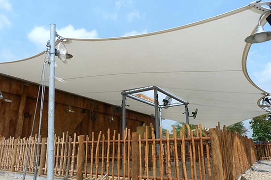 钢膜结构棚具有美观舒适的外观,经久耐用的性能,防雨防晒、透光性能好、抵抗风力强等特点。在搭建过程中,由于膜结构的重量较轻、安装便捷,可以大大减少对地基的要求和对现场环境的破坏,避免了传统建筑在施工过程中对周围环境的干扰和破坏。钢膜结构棚采用优质的材料,具有一定的抗老化、防污和易清洗特性,施工完毕后无需花费大量人力和物力对其进行维护和清洁。