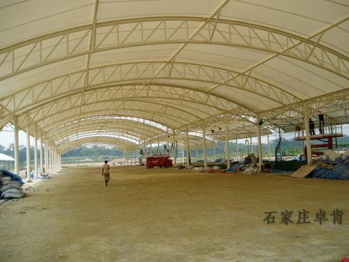 C类是三类中蕞次的,以聚酯(涤纶)织物为基材涂PVC而成。按涂层材料分,有聚四氟Ethylene(PTFE)、聚偏氟Ethylene(PVDF)、聚氟Ethylene(PVF)、聚氯Ethylene(PVC)、聚氨酯(PU)、橡胶等,它的寿命因不同的表面涂层而异,yi般可达12—50年。河北膜结构石家庄卓肯