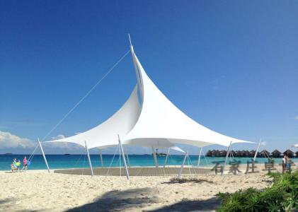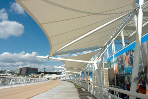 膜结构罩棚具有透光和fang紫外线功能,在yi些室外建筑和环境小品中得到广泛 的应用。正是由于这yi特征,夜间的灯光设计使膜结构具有鲜明的环境标志特征 。 优美造型的膜材,不锈钢配件和紧固件加上设计轻巧合理,表面处理严格的,钢结构支撑,塑造出形式美观,设计合理的膜结构,在当今世界范围内的建筑环 境设计中占有举足轻重的地位。