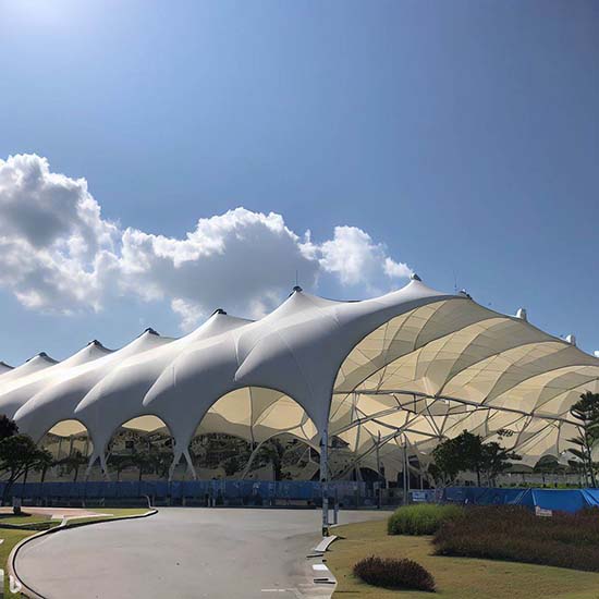 轻巧但坚固: 膜结构材料重量轻,却能承受巨大的压力和风力,确保看台结构的安全性和稳定性。